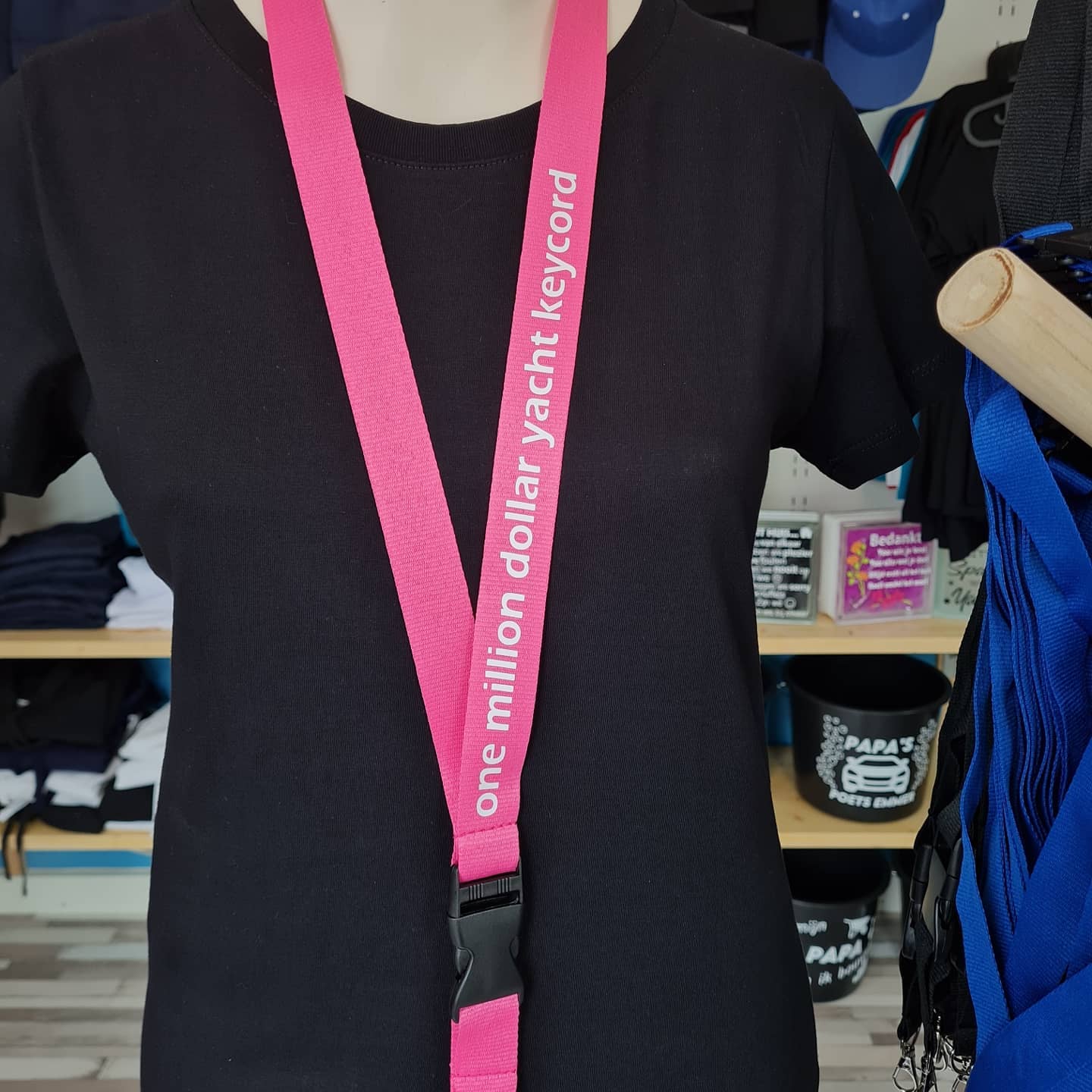 keycord van 25 mm breed. Deze keycord is uitgevoerd met een veiligheidssluiting in de nek en met een afneembaar voorstuk. De metalen musketonhaak maakt de keycord compleet.