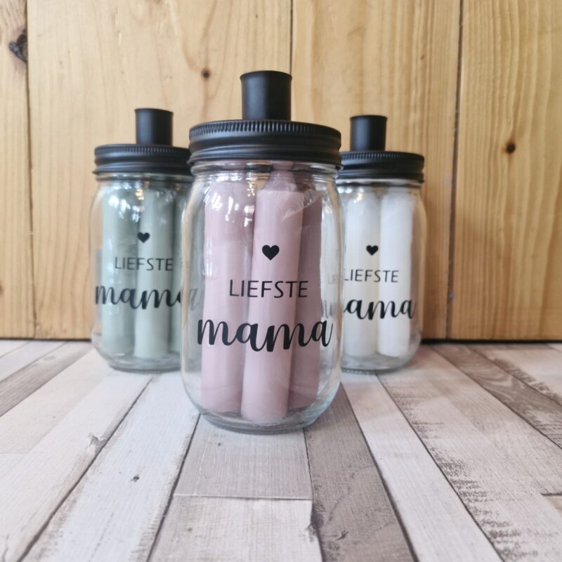 Deze stijlvolle glazen pot is niet zomaar een verpakking; de zwarte metalen deksel dient namelijk direct als kandelaar. In de pot vind je 5 dinerkaarsen in een kleur naar keuze, zodat de ontvanger direct kan genieten van sfeer en gezelligheid in huis.